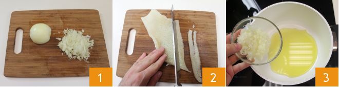 Um die Kutteln nach Parmesanart zuzubereiten, hacken Sie die Zwiebel fein 2 und schneiden Sie die Kutteln in Streifen 2. In einem hohen und geräumigen Topf lassen Sie die Zwiebel mit nativem Olivenöl extra anbraten 3 und