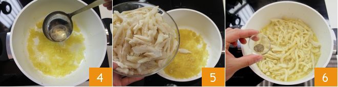 lassen Sie sie etwa zehn Minuten lang dünsten, indem Sie etwas Rinderbrühe hinzufügen 4. Sobald die Zwiebel weich ist, fügen Sie die Kutteln hinzu 5 und braten Sie sie 5-6 Minuten lang an. Würzen Sie mit Salz und Pfeffer 6 und