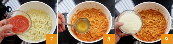 geben Sie die Tomatensoße dazu 7. Lassen Sie alles zusammenziehen und rühren Sie mit einem Holzlöffel um, dann lassen Sie alles ohne Deckel bei schwacher Hitze etwa 2 Stunden lang kochen, indem Sie von Zeit zu Zeit eine Kelle Rinderbrühe hinzufügen 8, damit die Kutteln nicht austrocknen und weich werden. Zum Ende der Garzeit fügen Sie den geriebenen Parmigiano Reggiano hinzu 9, mischen Sie und servieren Sie Ihre Kutteln nach Parmesanart.