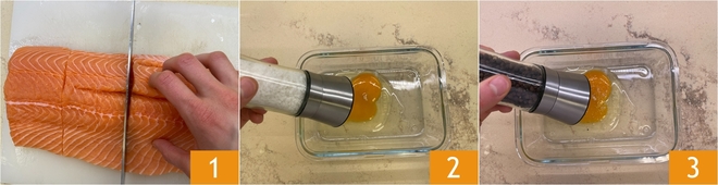 Um den Lachs in Pistazienkruste zuzubereiten, schneiden Sie zuerst 4 Lachssteaks von etwa 200 g pro Stück 1. In einer Auflaufform die Eier geben und mit Salz 2 und Pfeffer 3 würzen.