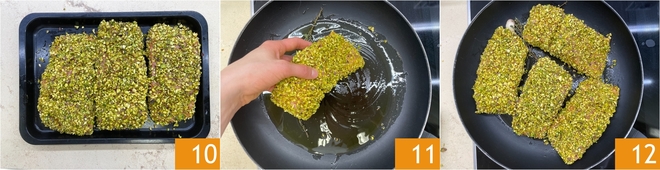 Stellen Sie sicher, dass die Pistazienbrösel gut auf allen Seiten des Lachses haften 10. Legen Sie die Steaks in die Pfanne 11 und braten Sie sie bei mittlerer Hitze etwa 10 Minuten 12.