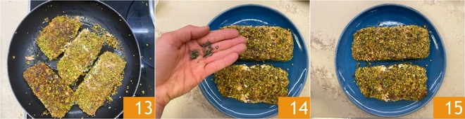 Nach dieser Zeit drehen Sie sie um und braten Sie sie weitere 10 Minuten auch auf der anderen Seite (die Garzeit kann je nach Dicke des Steaks variieren) 13. Wenn der Lachs fertig und die Kruste goldgelb ist, duften Sie mit weiterem frischem Thymian 14. Ihr Lachs in Pistazienkruste ist bereit, serviert zu werden 15!