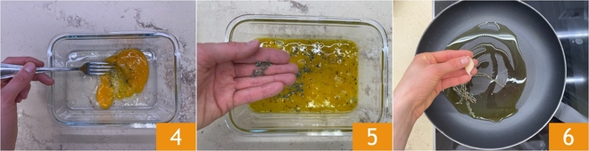 Schlagen Sie die Eier mit einer Gabel 4 und duften Sie mit frischen Thymianblättern 5. In einer Pfanne lassen Sie ein wenig Öl mit frischem Thymian und einer Knoblauchzehe anbraten 6.