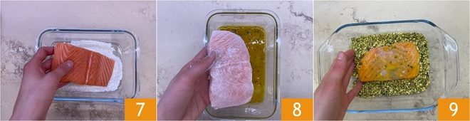 Wenden Sie die Lachssteaks zuerst in Mehl 7 und dann in den geschlagenen Eiern 8. Schließlich bedecken Sie sie mit den Pistazienbröseln 9.