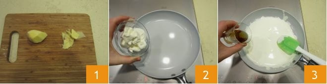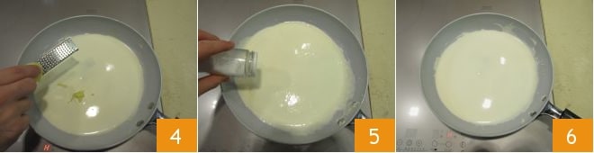 Fügen Sie den geriebenen Ingwer hinzu 4, eine Prise Salz 5, rühren Sie, um die Zutaten zu vermischen, und schalten Sie die Hitze aus. Ihre Sauerrahmsoße ist nun fertig 6, bewahren Sie sie bis zum Servieren auf.