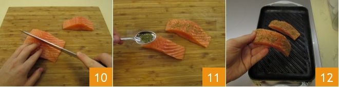 Schneiden Sie das Filet nun in 4 Stücke 11 und bestreuen Sie sie mit dem frisch gemahlenen grünen Pfeffer 12. Braten Sie die Lachsstücke dann für etwa 5-6 Minuten auf einem heißen Grill 13, und wenden Sie sie nur einmal zur Hälfte der Garzeit.