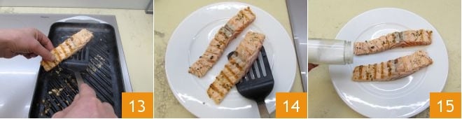 Einmal gekocht 13, legen Sie die Lachsfilets auf einen Teller 14 und salzen Sie sie 15.