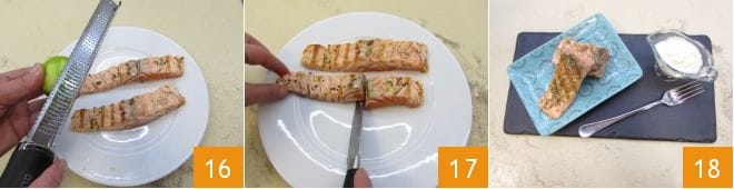 Würzen Sie dann mit der frisch geriebenen Limettenschale 16. Wenn Sie möchten, können Sie die Filets halbieren 17, um ein ausgewogeneres Anrichten zu erzielen. Servieren Sie Ihre Lachsfilets mit grünem Pfeffer, Ingwer und Limette zusammen mit der Sauerrahmsoße 18!