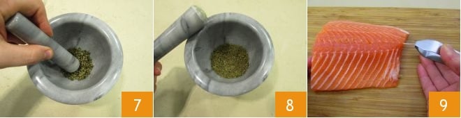 Geben Sie den grünen Pfeffer in einen Mörser und zerstoßen Sie ihn 7 zu Pulver 8 (alternativ können Sie den Boden eines Glases verwenden, um ihn zu zerstoßen). Nehmen Sie das Lachsfilet und entfernen Sie mit einer Pinzette eventuelle Gräten 9, um sie zu finden, reicht es, das Filet mit den Fingern zu streichen. Wenn Ihr Filet Haut aufweist, entfernen Sie diese ebenfalls mit einem sehr scharfen Messer.