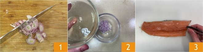 Um die Lachsforelle in Pistazienkruste vorzubereiten, schälen und hacken Sie die Schalotte 1, dann legen Sie sie in eine Schüssel mit gleichen Teilen Essig und Wasser 2, um den Geschmack zu mildern. Nehmen Sie die sauberen Forellenfilets mit Haut und entfernen Sie die Gräten 3. Wenn Sie den Fisch im Ganzen gekauft haben, können Sie unserem Leitfaden folgen: Wie man eine Lachsforelle reinigt.