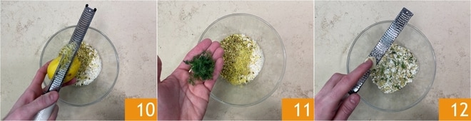 Fügen Sie auch die abgeriebene Zitronenschale 10, den Dill 11, den geriebenen Knoblauch 12 und das Öl hinzu.