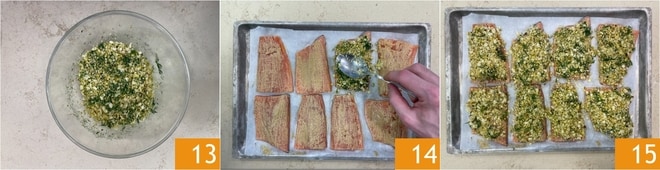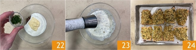 Mischen Sie alles gut 13 und bedecken Sie die Filets mit der Panade 14, Sie sollten eine Dicke von etwa 1 cm erreichen 15. Beträufeln Sie sie mit etwas Öl und backen Sie sie im vorgeheizten Umluftofen bei 190° für 12-13 Minuten (die Zeit kann je nach Dicke des Filets variieren).