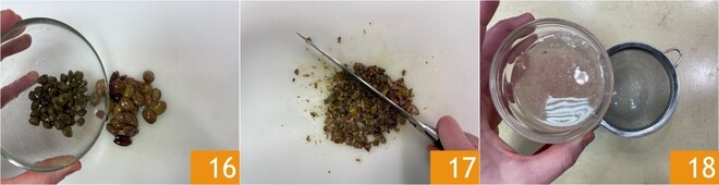 In der Zwischenzeit bereiten Sie die Sauce vor: Hacken Sie Kapern und Oliven 16 17 und geben Sie sie in eine Schüssel. Lassen Sie die Schalotten abtropfen 18.