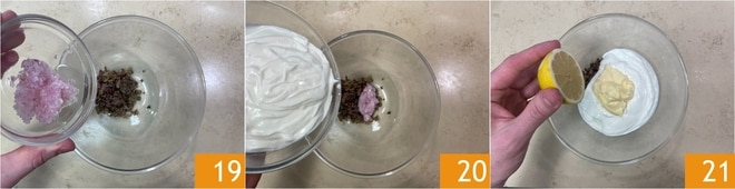 Geben Sie sie in die Schüssel 19 mit dem Joghurt 20, der Mayonnaise und dem Zitronensaft 21.