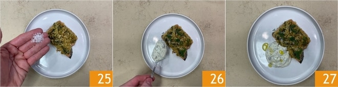 Richten Sie die Lachsforelle in Pistazienkruste an und garnieren Sie mit Salzflocken 25, dann fügen Sie die Sauce daneben hinzu 26. Vervollständigen Sie das Gericht mit einigen Tropfen frischem Öl 27!