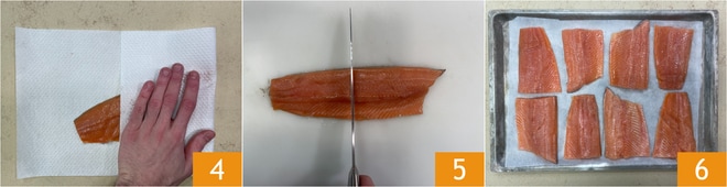 Tupfen Sie sie mit Küchenpapier ab 4, teilen Sie sie dann in der Mitte 5 und legen Sie sie auf ein mit Backpapier ausgelegtes Blech 6.