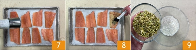 Salzen Sie 7 und bestreichen Sie sie mit etwas Senf 8. Bereiten Sie die Panade vor: In einer Schüssel geben Sie das Panko und die gehackten Pistazien 9.