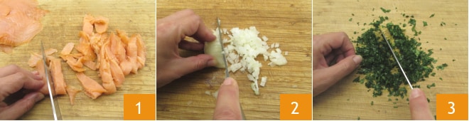 Um die Lachs Nudeln zuzubereiten, bringen Sie zuerst einen Topf mit Wasser zum Kochen, um die Nudeln zu kochen, und salzen Sie das Wasser, sobald es kocht. Schneiden Sie den Lachs in Streifen 1; zerkleinern Sie den Lachs nicht zu sehr, sonst zerfällt er in der Pfanne. Schälen und hacken Sie die Zwiebel fein 2, dann hacken Sie auch die Petersilie 3.