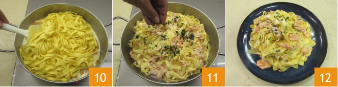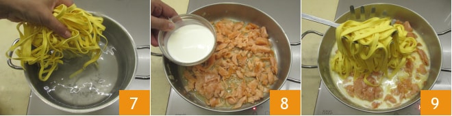 An diesem Punkt sollte das Wasser kochen, also salzen Sie es und kochen die Tagliatelle für die auf der Packung angegebene Zeit 7. In der Zwischenzeit gießen Sie die Sahne in die Pfanne mit dem Lachs, weiterhin bei ausgeschalteter Hitze 8. Wenn die Tagliatelle gekocht sind, lassen Sie sie abtropfen und geben Sie sie direkt in die Pfanne 9.