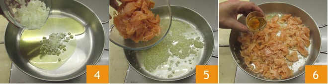 Erhitzen Sie das Öl in einer Pfanne und braten Sie die Zwiebel an 4, dann fügen Sie den Lachs hinzu 5 und erhöhen die Hitze. Nachdem Sie den Lachs einige Minuten angebraten haben, löschen Sie mit dem Brandy ab 6 und lassen ihn vollständig verdampfen, dann schalten Sie die Hitze ab.