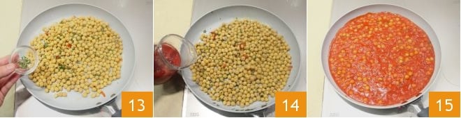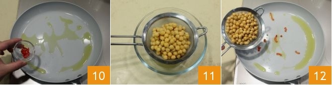 dann den Knoblauch entfernen und die gehackte frische Chilischote hinzugeben 10; anbraten und in der Zwischenzeit die inzwischen gekochten Kichererbsen abgießen 11. In die Pfanne geben 12