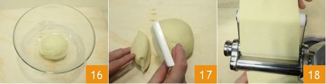 In der Zwischenzeit den Teig wieder aufnehmen 16, in kleine Stücke teilen 17 und mit der Nudelmaschine nach und nach dünner ausrollen, bis eine Dicke von 2 mm erreicht ist (Sie können den Teig auch mit einem Nudelholz ausrollen) 18.