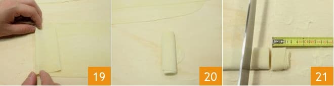 Sie sollten einen dünnen Teigstreifen erhalten, den Sie auf sich selbst aufrollen (19-20). Schneiden Sie jede Teigrolle in Stücke von 2 cm Dicke 21,