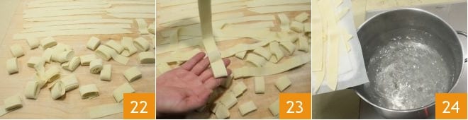 und fahren Sie auf die gleiche Weise fort, bis der gesamte Teig verarbeitet ist 22; dann können Sie die Lagane von Hand ausbreiten 23 und auf ein leicht bemehltes Tablett legen, mit einem sauberen Tuch bedeckt; 15-20 Minuten ruhen lassen. Dann in einem großen Topf Salzwasser zum Kochen bringen und die Lagane für wenige Sekunden kochen lassen 24