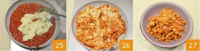 dann die Pasta mit einem Pastalöffel abgießen und in die Pfanne mit den Kichererbsen geben 28; einige Augenblicke vermengen 26, dann eine Minute ruhen lassen, bevor Sie die Lagane mit Kichererbsen heiß servieren 27!