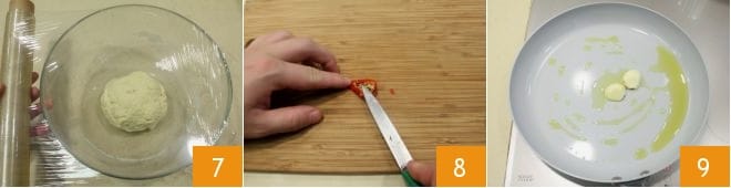 Eine Teigkugel formen, mit Frischhaltefolie abdecken 7 und bei Raumtemperatur mindestens eine halbe Stunde ruhen lassen, damit sich der Teig entspannen kann. In der Zwischenzeit die Kerne der frischen Chilischote entfernen 8 und hacken, den Knoblauch schälen und halbieren; dann in einer großen Pfanne mit dem Öl anbraten 9