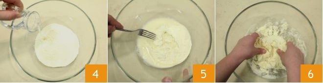 In der Zwischenzeit widmen Sie sich den Lagane: In eine Schüssel den Hartweizengrieß geben und das Wasser bei Raumtemperatur nach und nach unter Rühren mit einer Gabel hinzufügen 4. Den Teig direkt in der Schüssel von Hand 6 kneten, bis er eine glatte und homogene Konsistenz erreicht.