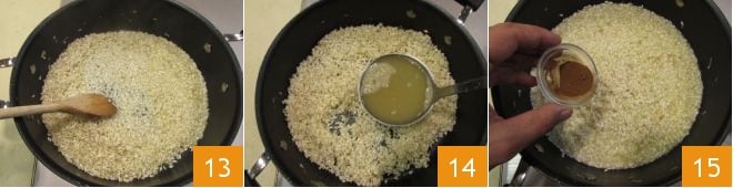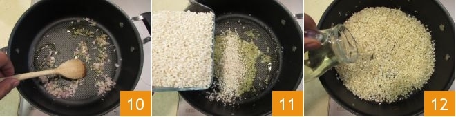 Gießen Sie einen Schuss Öl in einen anderen Topf, fügen Sie die Schalotte hinzu 10 und lassen Sie sie bei niedriger Hitze weich werden. Fügen Sie den Reis hinzu 11 und rösten Sie ihn 2-3 Minuten lang an, indem Sie die Hitze leicht erhöhen. Löschen Sie mit Weißwein ab 12