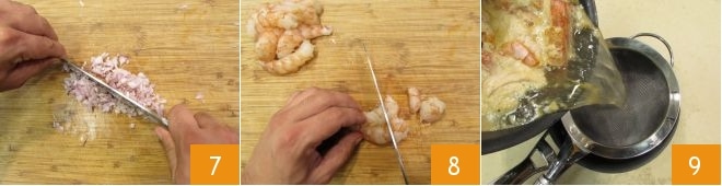 In der Zwischenzeit die Schalotte fein hacken 7 und die Garnelen in Stücke schneiden 8. Dann die Brühe abseihen und warm halten 9.