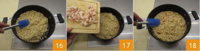 und rühren Sie um 16. Fügen Sie auch die Garnelenstücke hinzu 17 und rühren Sie erneut um 18.