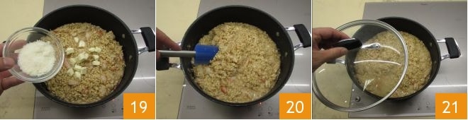 Warten Sie etwa 3 Minuten, dann schalten Sie die Hitze ab; fügen Sie dann Butter, Pecorino 19 hinzu und mischen Sie sie mit dem Rest, um das Risotto zu cremig zu machen 20. Decken Sie es mit einem Deckel ab 21 und warten Sie noch ein paar Minuten.