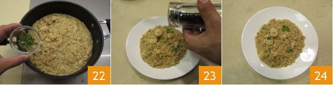 Vervollständigen Sie mit frisch gehacktem Oregano 22 und fügen Sie noch ein paar Tropfen Brühe hinzu, um die gewünschte Konsistenz zu erreichen. Anrichten, ein wenig schwarzen Pfeffer über jedes Gericht reiben 23 und Ihr Risotto mit Lakritz und Garnelen heiß servieren 24!
