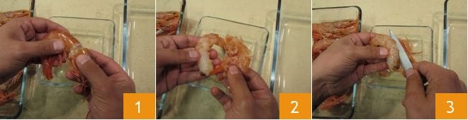 Um das Risotto mit Lakritz und Garnelen zuzubereiten, beginnen Sie als erstes mit der Reinigung der Garnelen. Entfernen Sie zuerst den Kopf 1, dann die Beine und den Panzer 2 und bewahren Sie alles auf. An diesem Punkt schneiden Sie den Rücken jeder Garnele ein 3 und entfernen den schwarzen Faden. Für weitere Tipps besuchen Sie unsere Kochschule: Wie man Garnelen reinigt.