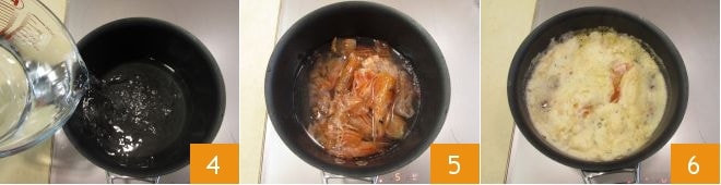 Gießen Sie dann das Wasser in einen Topf 4, fügen Sie die Köpfe und Panzer hinzu 5 und salzen Sie, dann lassen Sie es zum Kochen bringen 6 und warten Sie etwa 5 Minuten.