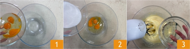 Um den laktosefreien Gugelhupf zuzubereiten, schlagen Sie zuerst die Eier in eine Schüssel 1, fügen dann den Zucker hinzu 2 und schlagen alles mit den Handmixern, bis eine helle, schaumige Masse entsteht. Anschließend geben Sie das Pflanzenöl in einem dünnen Strahl dazu und rühren dabei weiter mit den Mixern 3.
