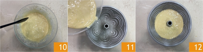 Sie sollten eine homogene, cremige Masse erhalten 10. Füllen Sie den Teig in eine Gugelhupf-Form mit 24 cm Durchmesser und 10 cm Höhe, die Sie zuvor eingefettet und bemehlt haben 11, und backen Sie ihn im vorgeheizten Backofen (Ober-/Unterhitze) bei 180 °C für ungefähr 40 Minuten 12.