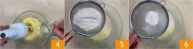 Geben Sie auch die Sojamilch dazu, während die Mixer laufen 4. Sieben Sie das Mehl direkt in die Schüssel 5 und dann das Backpulver 6, und heben Sie beides nach und nach unter, bis ein glatter, klumpenfreier Teig entsteht.