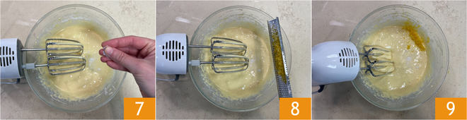 Fügen Sie eine Prise Salz hinzu 7 und aromatisieren Sie den Teig mit der abgeriebenen Zitronenschale 8. Nochmals kurz verrühren 9.