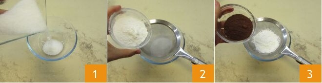 Um den laktosefreien Kakao-Zimt-Pudding zuzubereiten, beginnen Sie damit, den Zucker in eine Schüssel zu geben 1. Stellen Sie ein Sieb darüber und gießen Sie die Maisstärke 2 und den Kakao 3 hinein.
