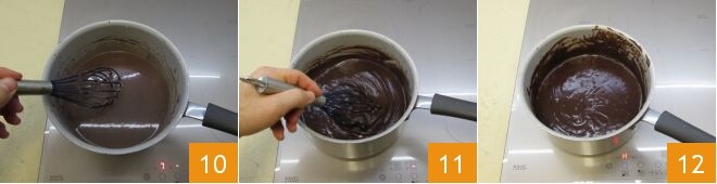 Wenn Sie eine glatte Mischung erhalten haben 10, schalten Sie den Herd ein und rühren Sie kontinuierlich 11, bis die Mischung eindickt und die ersten Blasen sichtbar werden 12. Es dauert etwa 3-4 Minuten Kochzeit bei mittlerer Hitze. Dann schalten Sie den Herd aus.