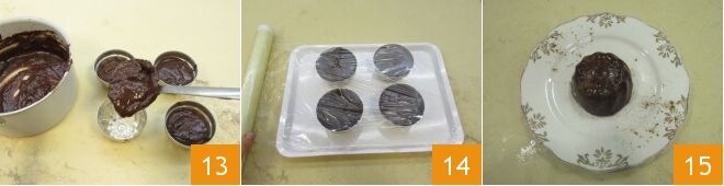 Befeuchten Sie das Innere der Förmchen mit Wasser und schütteln Sie sie, um überschüssiges Wasser zu entfernen; füllen Sie sie dann mit der noch heißen Creme 13 und lassen Sie sie etwa 15 Minuten bei Raumtemperatur abkühlen. Dann stellen Sie sie auf ein Tablett und decken alles mit Frischhaltefolie ab, ohne sie direkt auf den Pudding zu legen. Stellen Sie sie für etwa 3 Stunden in den Kühlschrank oder bis sie perfekt fest geworden sind; dann nehmen Sie sie heraus, stürzen Sie sie und servieren Sie den laktosefreien Kakao-Zimt-Pudding, indem Sie sie mit etwas Zimt bestäuben 15.