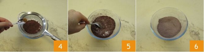 Fügen Sie auch eine Prise Zimt hinzu 4, sieben Sie alles und mischen Sie die Pulver 5, bis sie vollständig gleichmäßig sind 6.