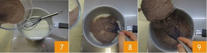 Gießen Sie die Milch in einen Topf und geben Sie nach und nach die Pulver hinzu 7. Rühren Sie mit einem Schneebesen schnell und kräftig, um die Bildung von Klumpen zu vermeiden 8. Fügen Sie weiterhin etwas Pulver hinzu 9 und fahren Sie auf diese Weise fort, bis sie aufgebraucht sind. Wir empfehlen, in drei Schritten hinzuzufügen.