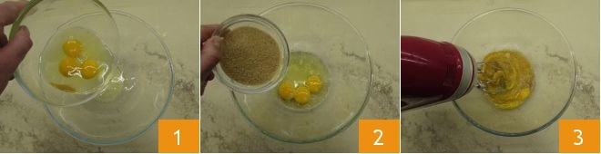 Um den laktosefreien Kuchen zuzubereiten, geben Sie zuerst die Eier in eine Schüssel 1, fügen Sie den braunen Zucker hinzu 2 und schlagen Sie alles eine Minute lang mit einem elektrischen Handmixer 3.