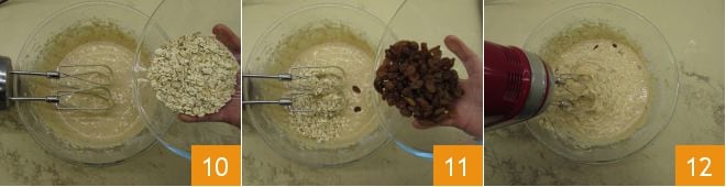 die Haferflocken und die Rosinen 11. Arbeiten Sie weiter mit dem elektrischen Handmixer, bis sie gut eingearbeitet sind 12.