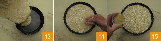 Gießen Sie die Mischung in eine 21,5 cm am Boden und 25 cm oben große Form, die zuvor gefettet wurde. Garnieren Sie die Oberfläche mit Haferflocken 14 und braunem Zucker 15.